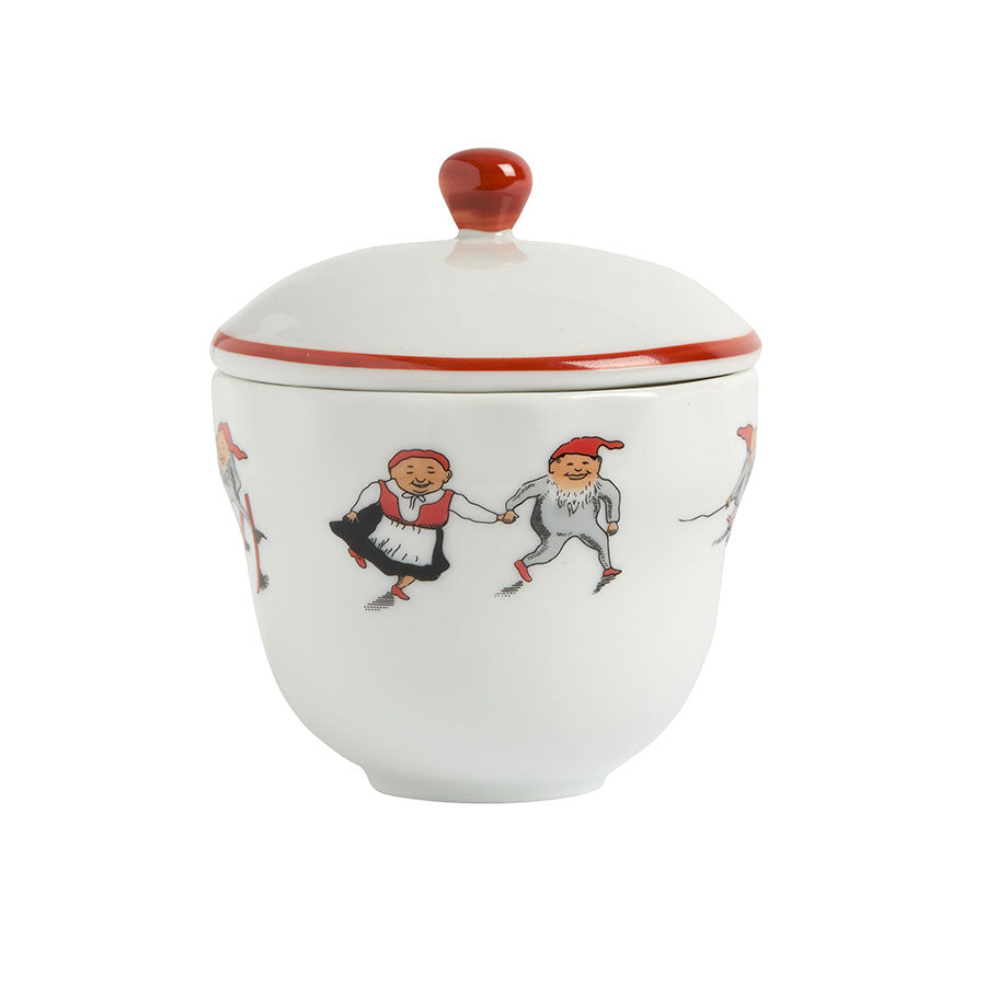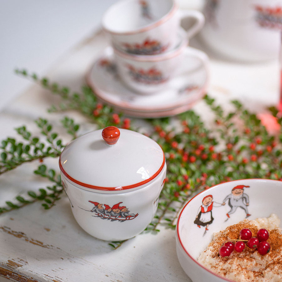 Skål med lokk i det nostalgiske Nisseserviset. Den måler 11 cm høy og 9,2 cm bred, og er perfekt til snop, sukker til kaffen, salt på bordet eller annet. Dette lille, sjarmerende elementet tilfører en koselig atmosfære til borddekkingen.