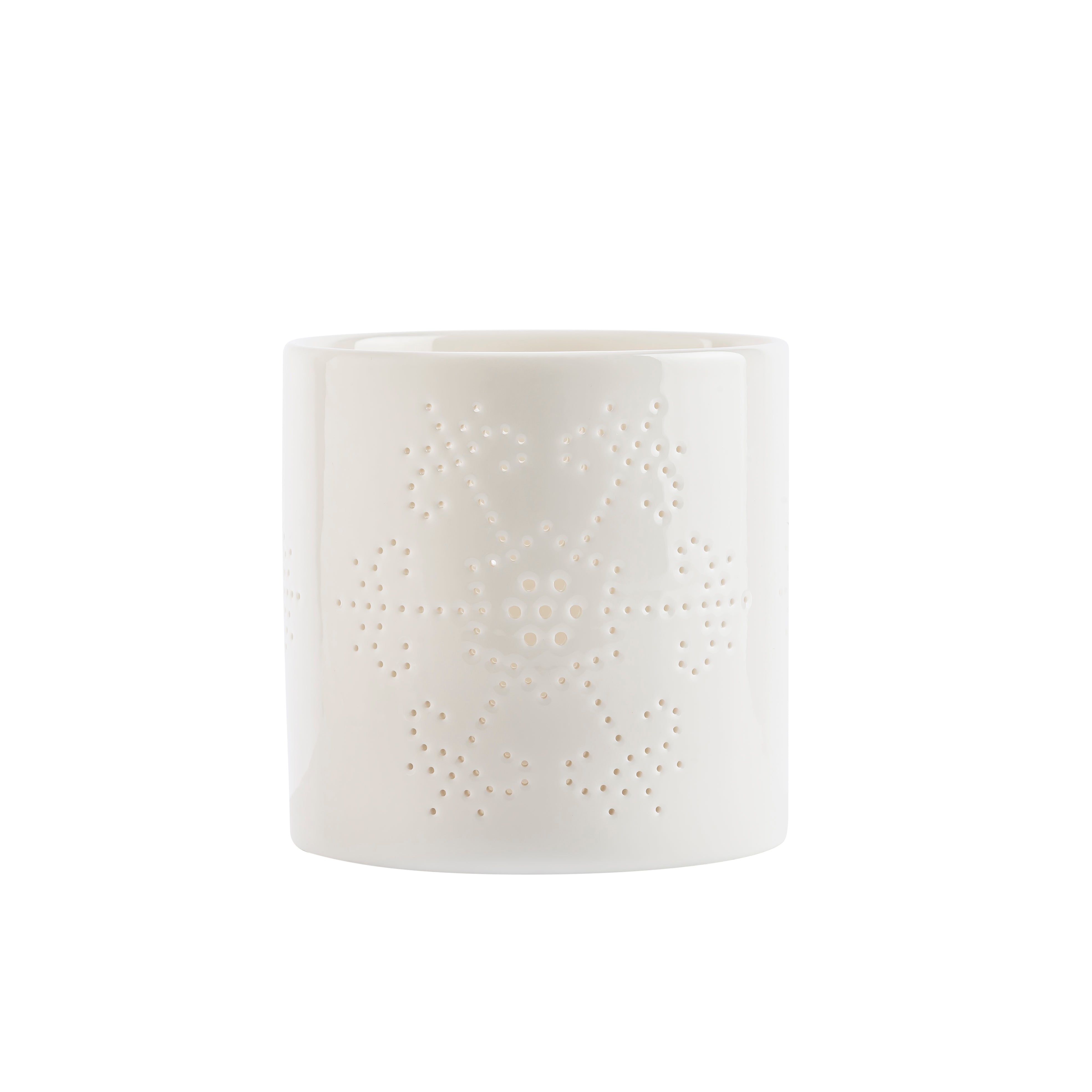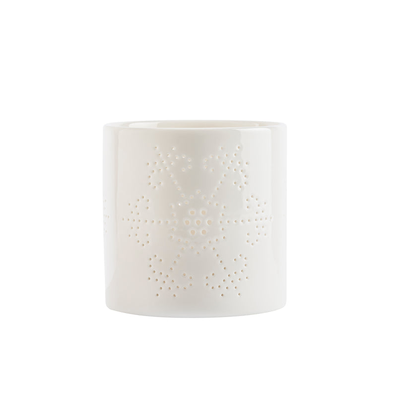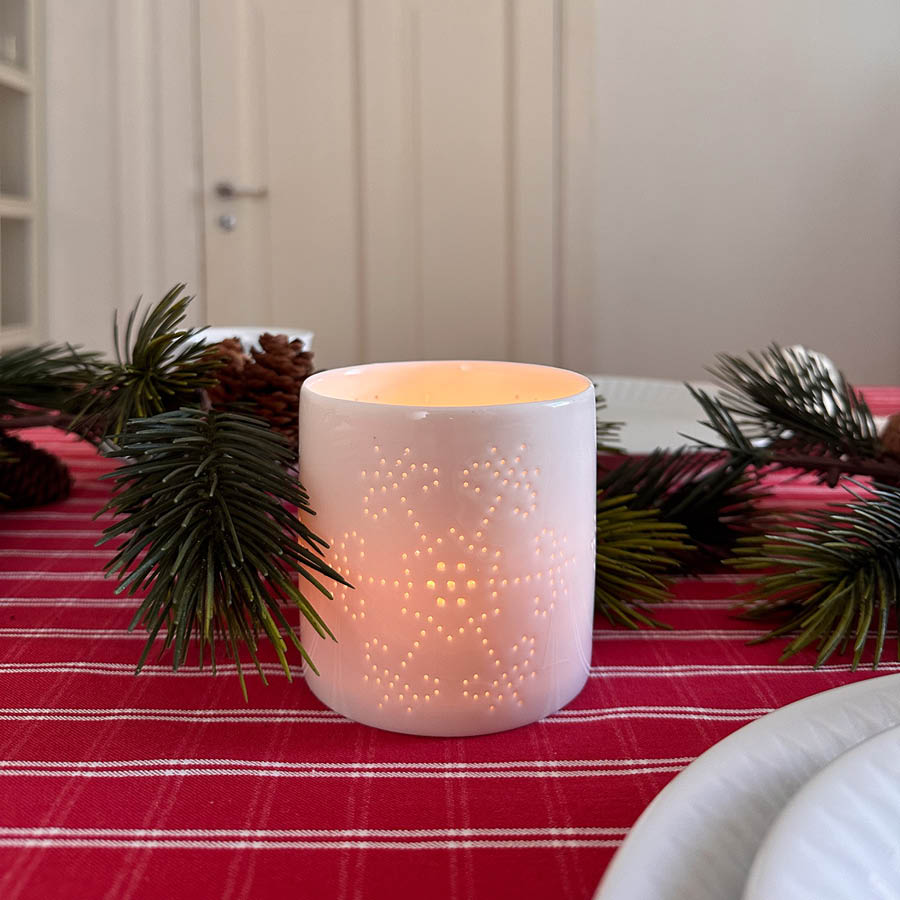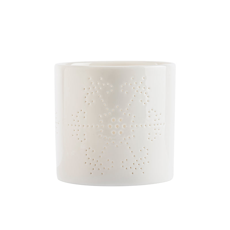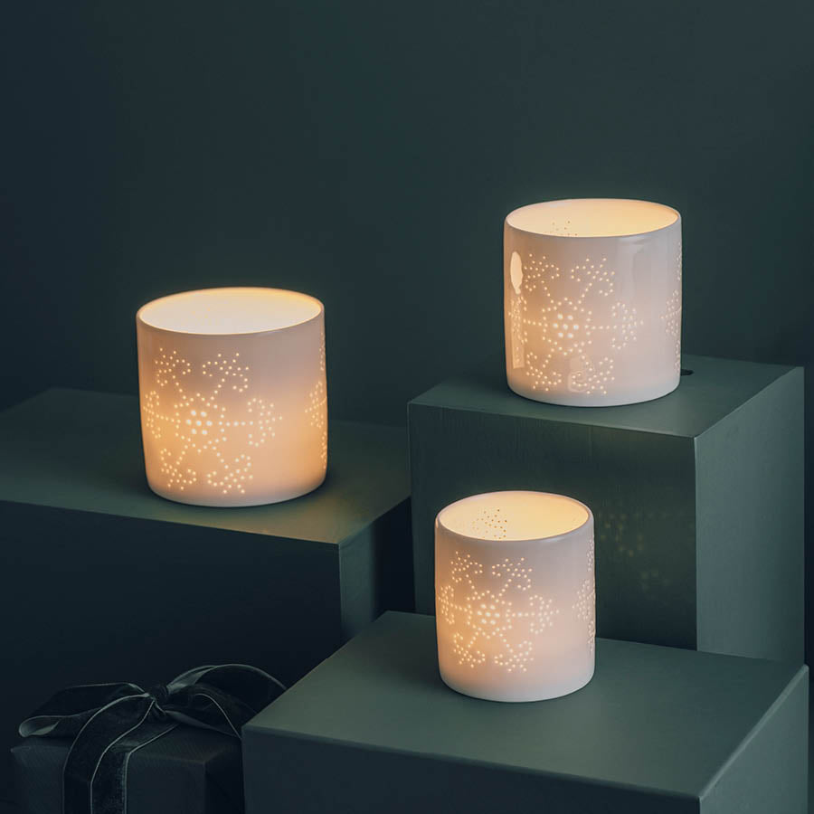 Skap en magisk atmosfære med våre snøfnugg lyslykter, som kommer i en praktisk 3 pk med høyder på 8, 10 og 12 cm. Lyslyktene er dekorative, klassiske og nostalgiske, med et kullmønster formet som snøstjerner, og de er fremstilt i hvitt porselen. De gir en varm og koselig atmosfære i den skjønne juletiden.