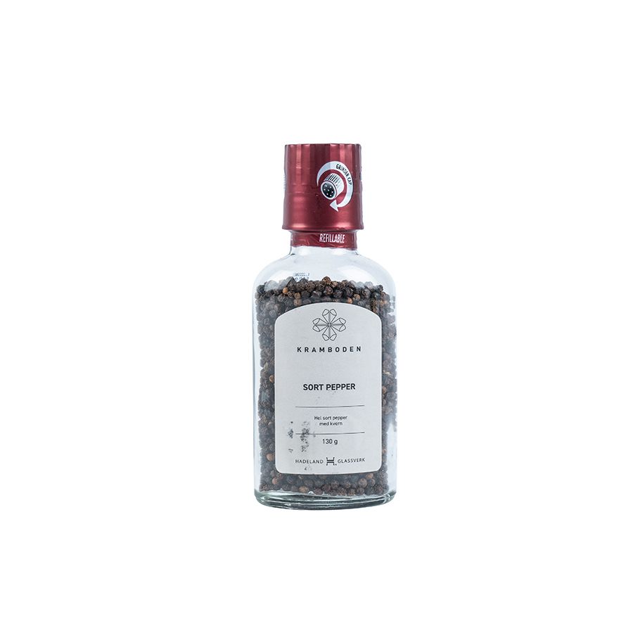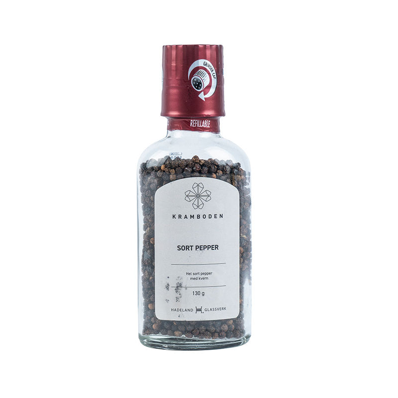 Pepperkvern med hel sort pepper fra Kramboden. Rommer 130 gram.