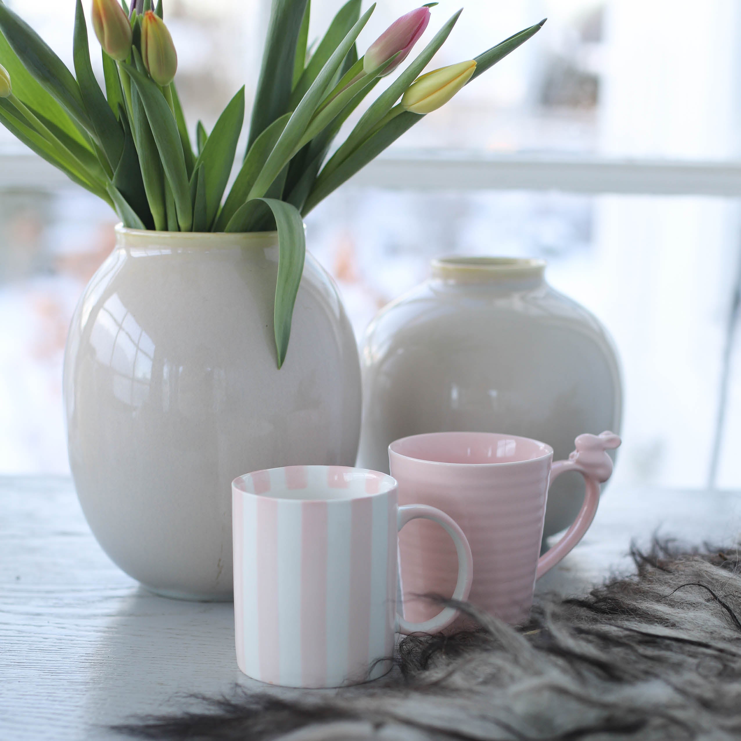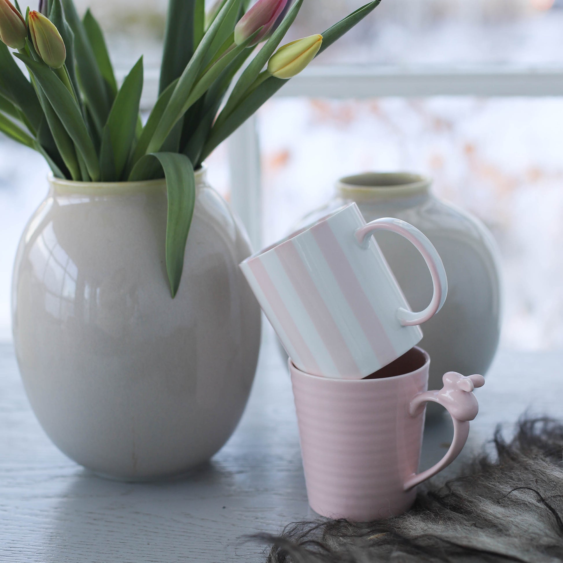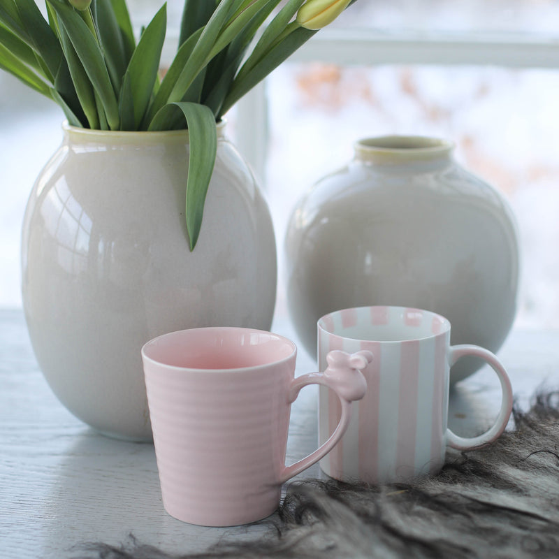 2-pakning krus i gaveeske, rosa. Ett krus er helt rosa, mens det andre har striper i rosa og hvitt. Den rosa koppen har en søt harepus på hanken, som gir en ekstra sjarmerende detalj. Perfekte for påsken, men vakre også hele året.