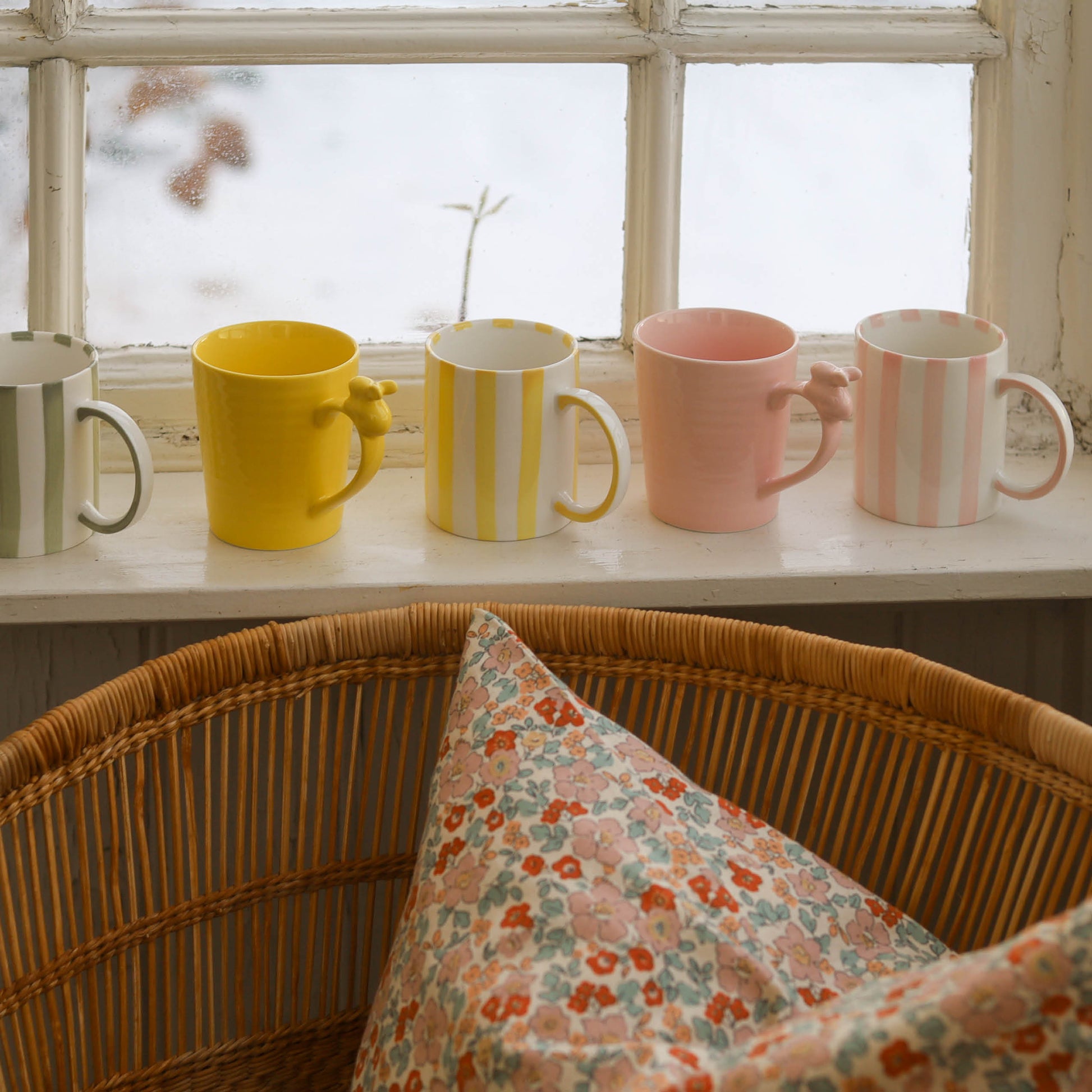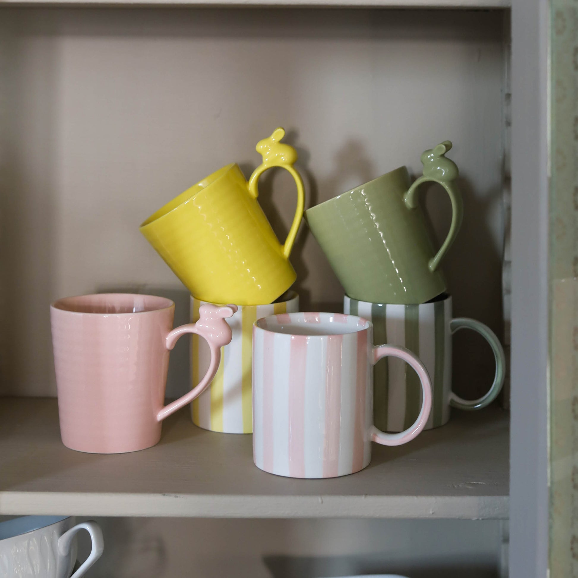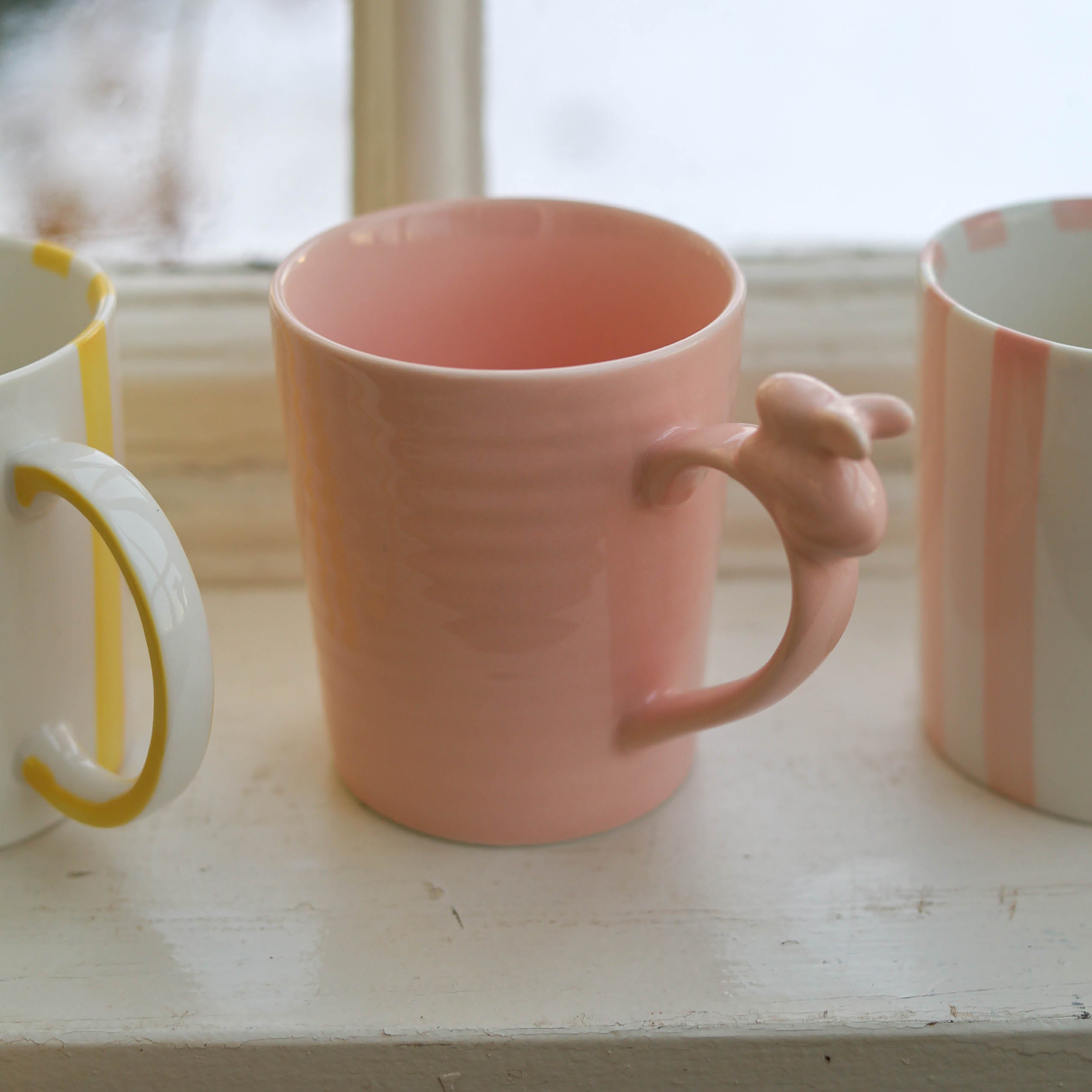2-pakning krus i gaveeske, rosa. Ett krus er helt rosa, mens det andre har striper i rosa og hvitt. Den rosa koppen har en søt harepus på hanken, som gir en ekstra sjarmerende detalj. Perfekte for påsken, men vakre også hele året.