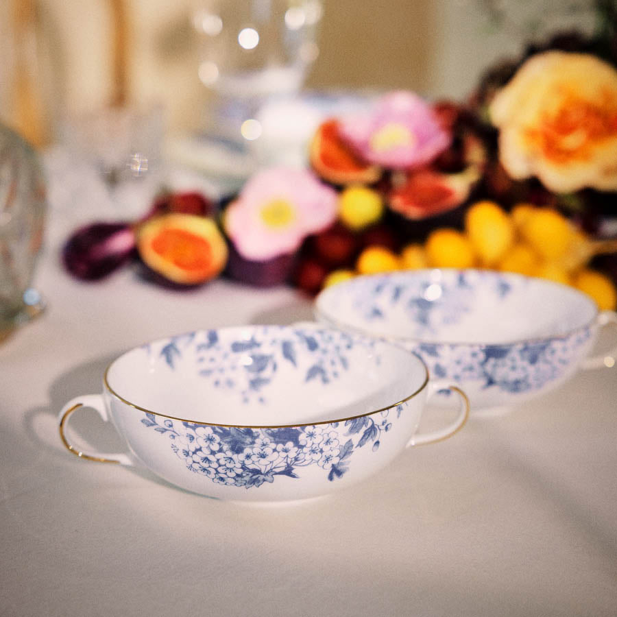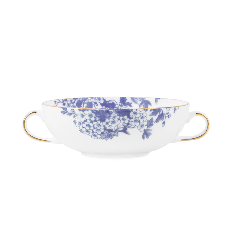 Denne elegante blå suppekoppen på 40 cl fra Porsgrunds Porselænsfabrik x byTiMo-kolleksjonen har to praktiske håndtak på sidene og er et allsidig tillegg til ditt bord. Med sin håndmalte gullkant tilfører den et luksuriøst preg, enten du bruker den til å servere suppe, forretter eller desserter. Koppen kan også fungere som et dekorativt element på bordet. Den egner seg også godt til litt attåt til kaffekoppen med matchende mønster. Uansett bruk tilfører den et sofistikert uttrykk til bordet ditt.