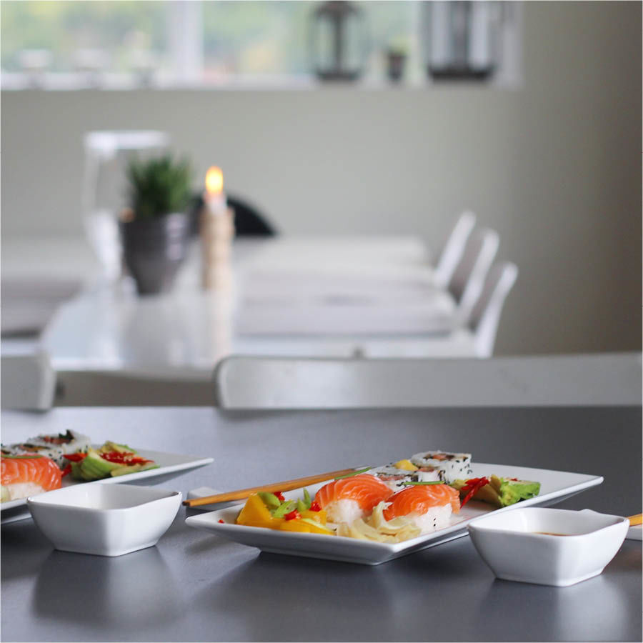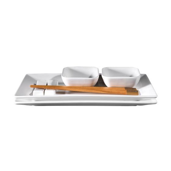 Sense SUSHI SETT for to personer er et stilrent og praktisk sett som gjør sushimåltidet til en elegant opplevelse. Settet inneholder to sushi-fat, to små skåler for saus eller tilbehør, to spisepinneholdere og to sett spisepinner. Perfekt for både hverdags og spesielle anledninger, dette settet er en flott gaveidé til sushi-entusiaster eller som en moderne tillegg til ditt eget middagsservise.