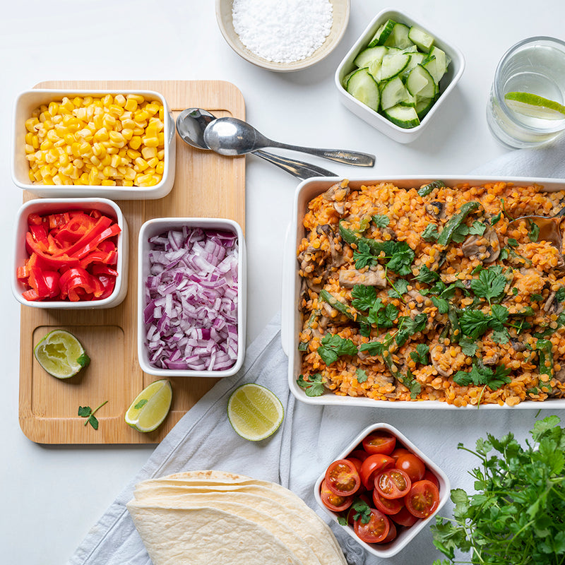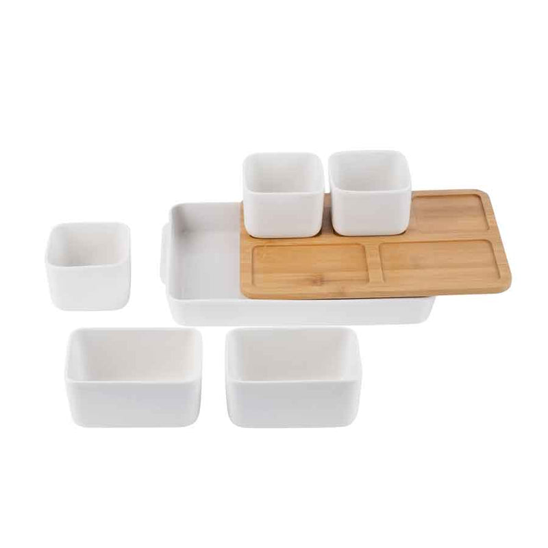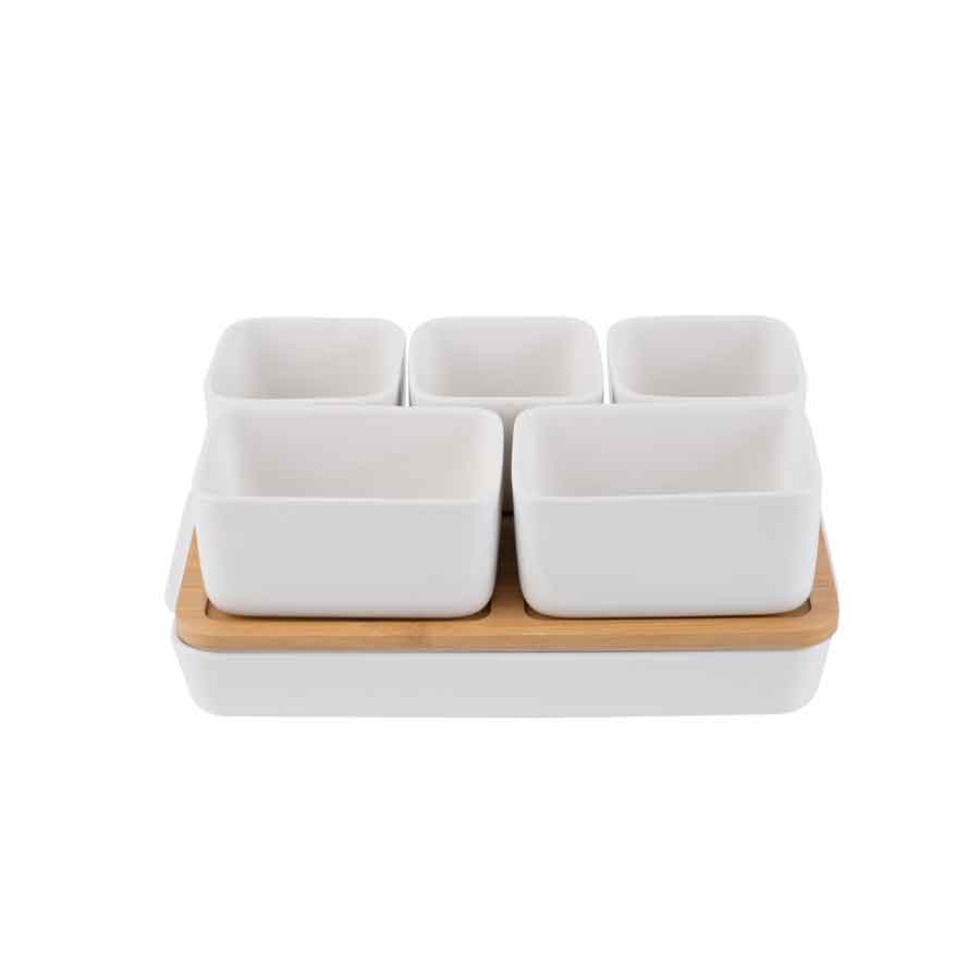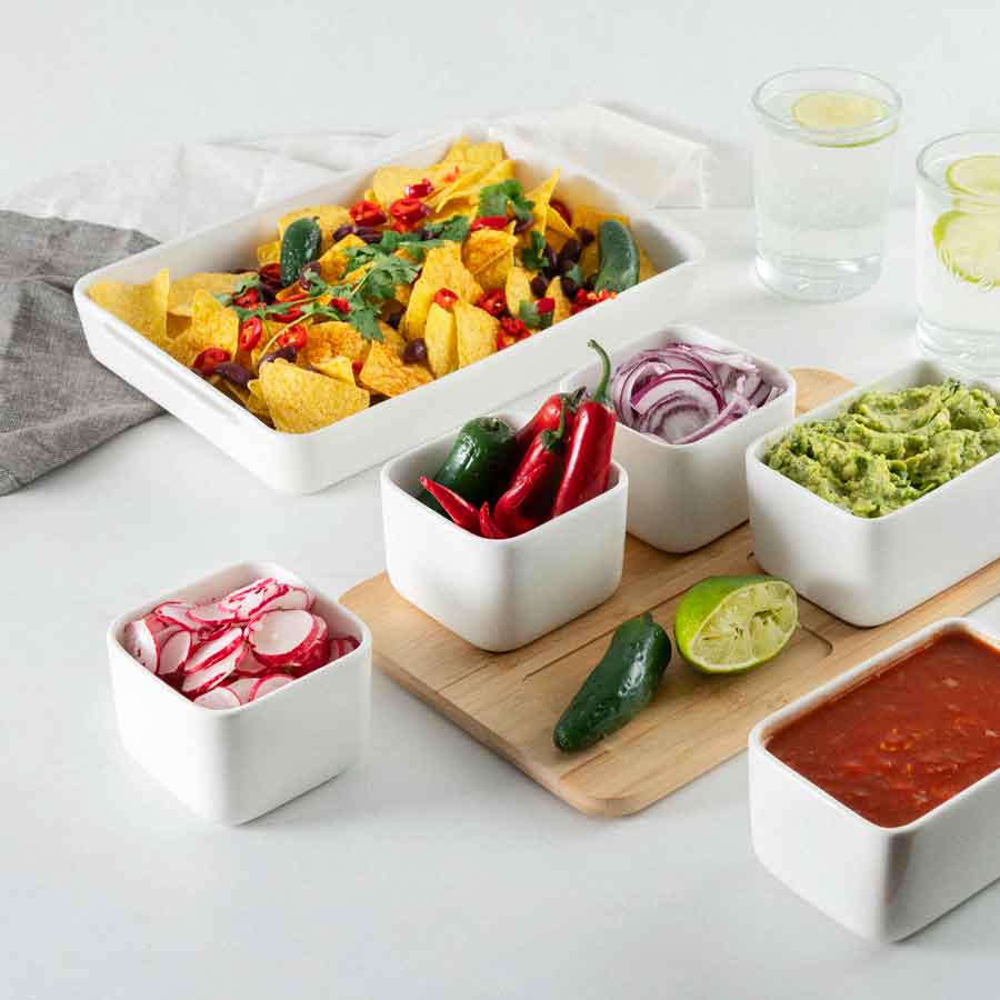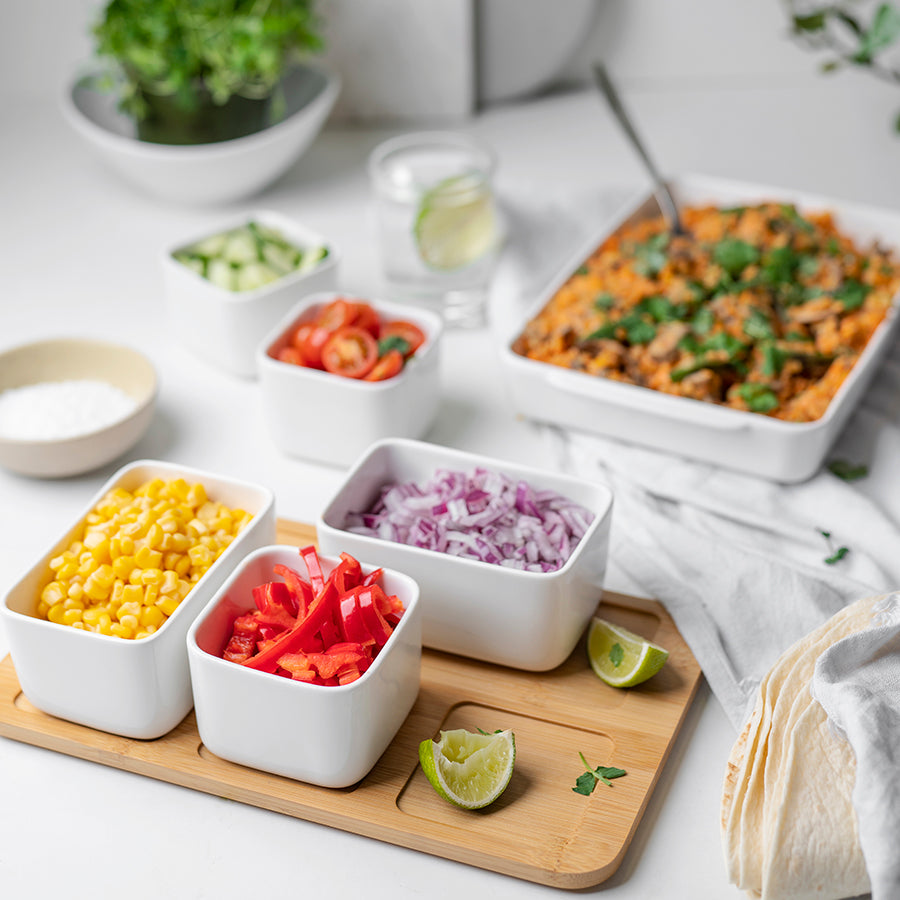 Taco-sett 7 deler består av seks porselensskåler, en stor form og et praktisk trebrett. Skålene og formen er laget av høybrent porselen for solid kvalitet og lang holdbarhet. De tåler jevnlig vask i oppvaskmaskin, kan fryses og brukes i mikrobølgeovn. Med sin kompakte størrelse er settet en bestselger hos Porsgrund Porselænsfabrik, og det passer enkelt inn i skapet.