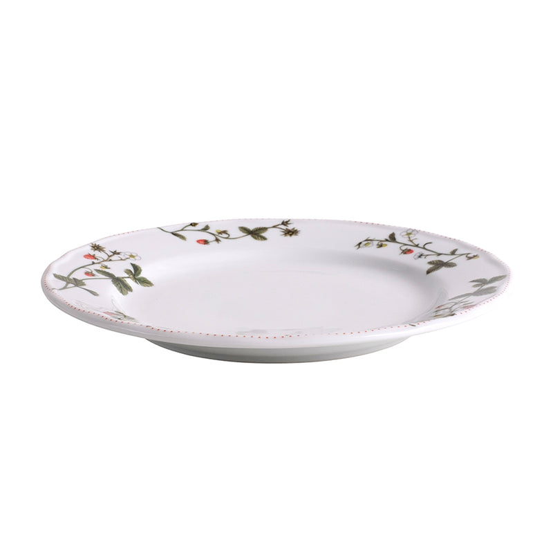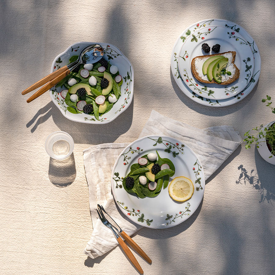 Tallerken, 25 cm i diameter, med det vakre Jordbæreng-mønsteret. Server sommersalaten, lunsjen eller middagen på tallerkenen, som er kjempefin å dekke på sammen med andre deler i Jordbæreng, eller f.eks. et hvitt servise.