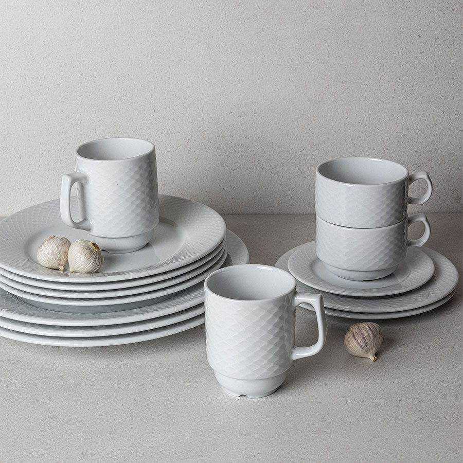 Fasett er et klassisk relieffservise. Lyset nærmest funkler som i et vannspeil når det brytes i fanerelieffets fasetter. Serviset serverer dine gjester med stil og eleganse. Design Anne Marie Ødegård.