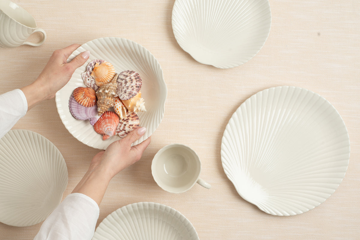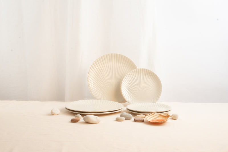Den større 26 cm blek sandtalleren kombinerer funksjonalitet med kunstnerisk design. De myke, bølgende linjene, inspirert av kamskjell, gir tallerkenen en naturlig eleganse, mens den varme sandtonen utstråler et beroligende uttrykk. Ideell for hovedretter eller som et dekorativt element på sommerbordet, og en perfekt følgesvenn for både hverdagsmiddager og spesielle anledninger.