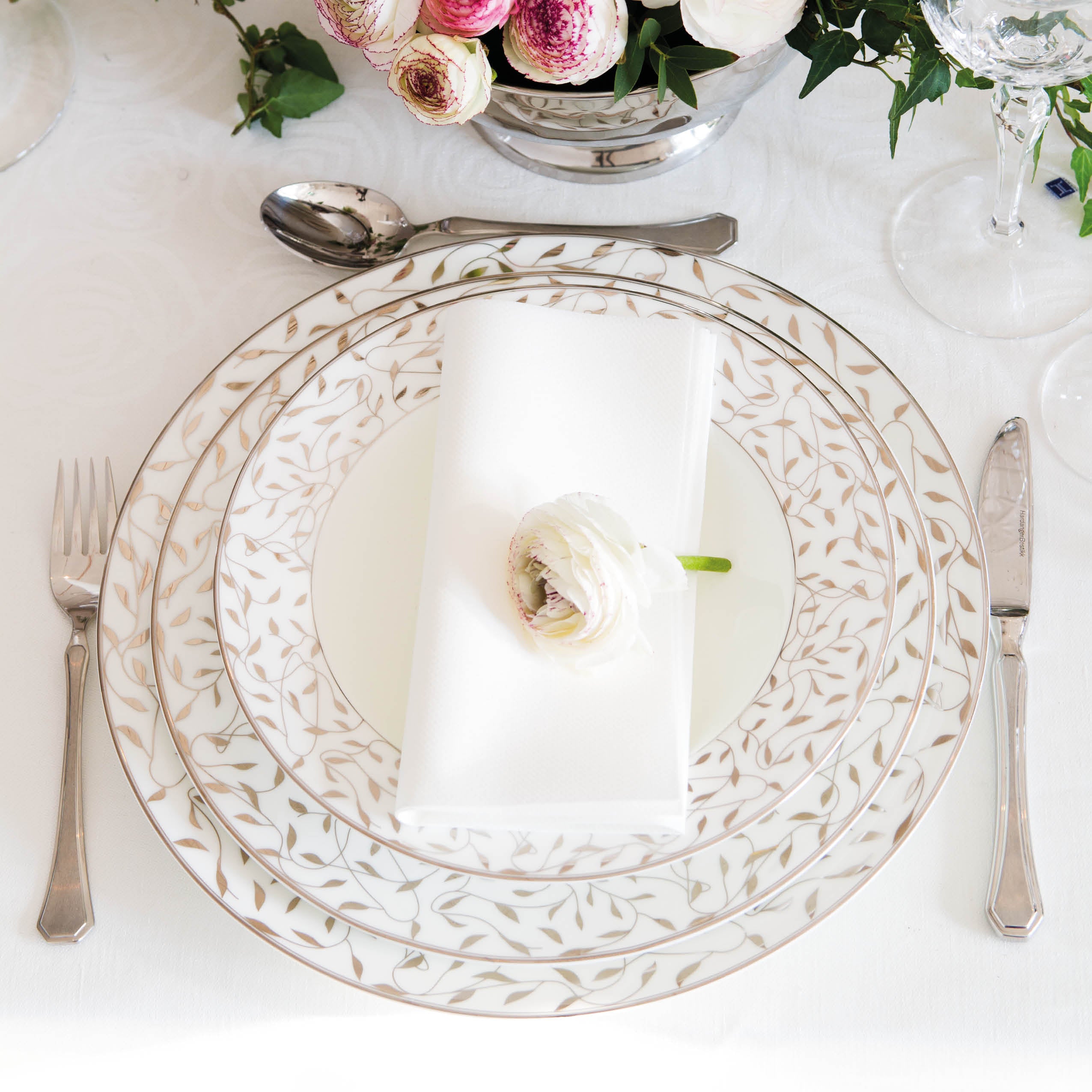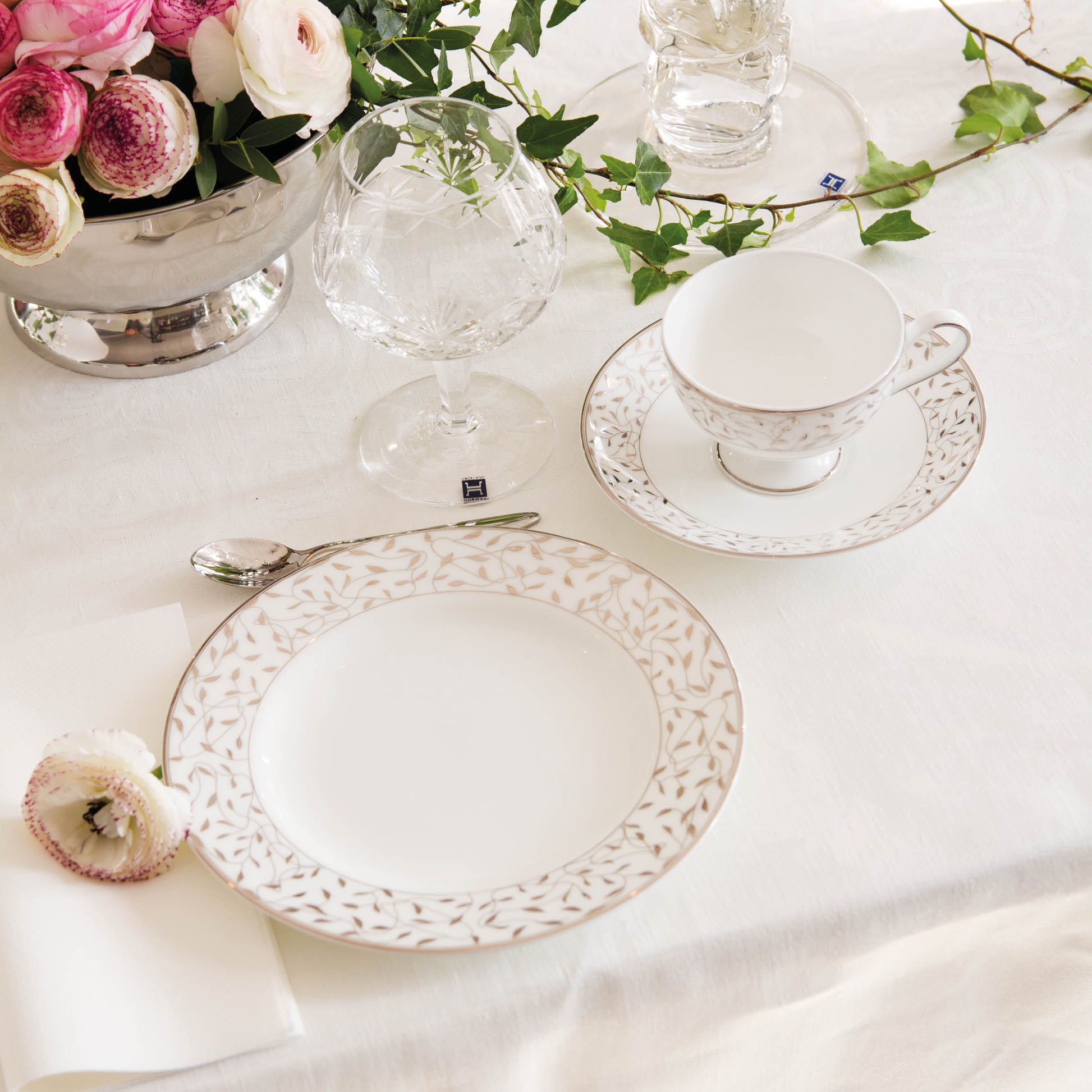 Cecilie er designet av Maud Gjeruldsen Bugge og ble lansert i 2011. Denne elegante dekoren er inspirert av yndige silhuetter fra løv og grener i motlys. Cecilie er et nydelig servise i benporselen som kommer med både gull og platina dekor. Cecilie passer veldig godt sammen med deler fra Nathalie. Både porselenet og dekoren har samme farger og kan lett mikses for å gi ditt personlige uttrykk. Benporselen er kremhvitt og mer gjennomskinnelig enn høybrent feltspatporselen og 100% tett.