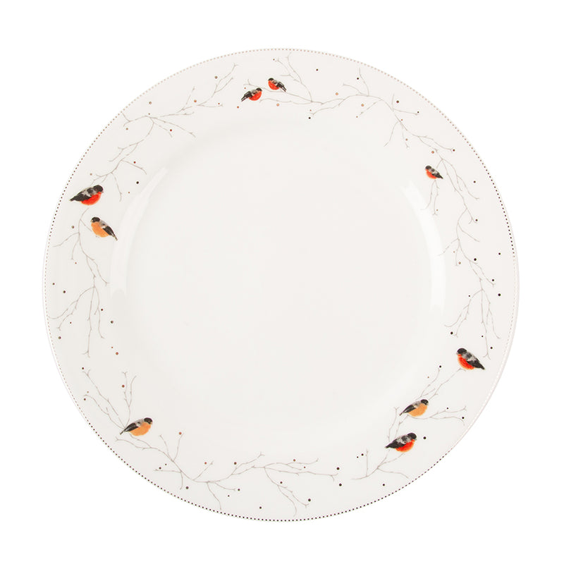Dompap tallerken, 27 cm, er en vakker og allsidig tallerken som passer perfekt til både hverdagsmåltider og festlige anledninger. Den elegante designen i benporselen gjør tallerkenen til et blikkfang på bordet, samtidig som den harmonerer med resten av Dompap-serien. Tallerkenens størrelse er ideell for servering av hovedretter, og de luksuriøse detaljene i ekte platina tilfører et sofistikert preg til borddekkingen, og bidrar til en koselig atmosfære rundt måltidet.