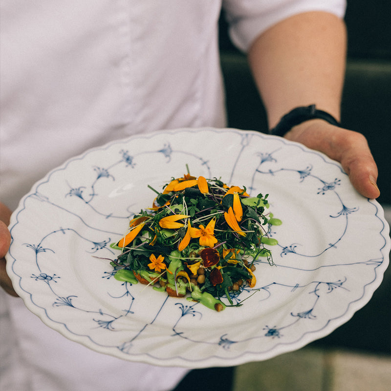 Tallerkenen på 27 cm i Bogstad Stråmønster er en romslig middagstallerken, perfekt til hovedretter. Den klassiske bredden gjør den også velegnet til servering av småkaker eller andre mindre retter, samtidig som de ikoniske Bogstad-rillene gir et elegant preg.