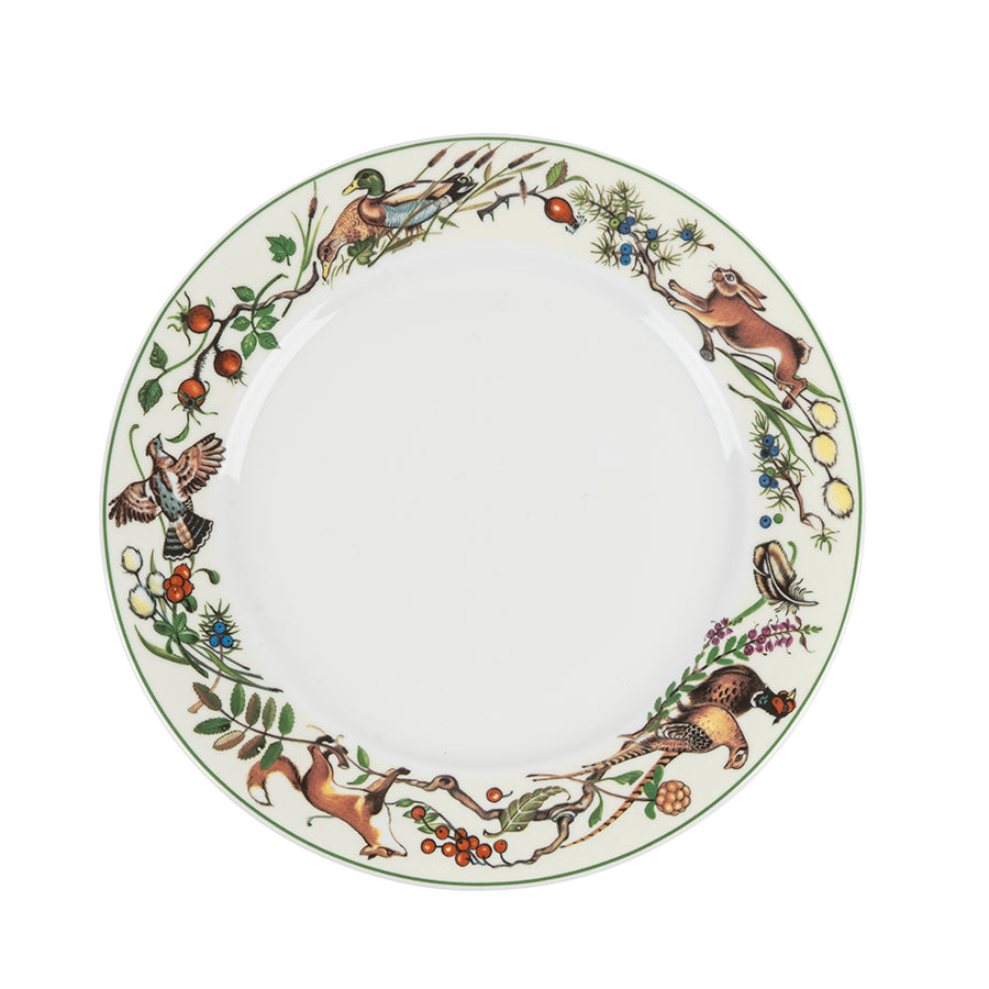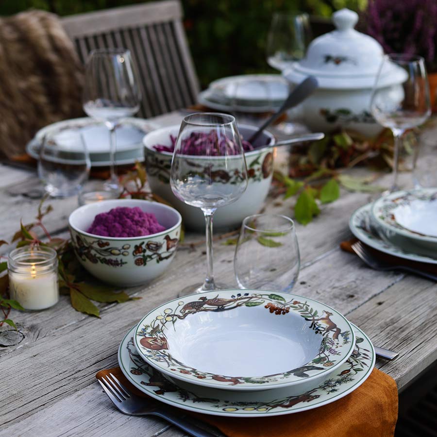 Faunamønsteret ble unnfanget da illustratør Astrid Reppe var på tur i den norske villmarka. Den norske faunaen med sin ville, uberørte, natur ble til et flott og robust design der både rev, hare og rype finnes mellom einebær og andre ville planter. Serviset ble lansert i 1998 Har du hytte på fjellet eller driver du med jakt? Fauna er det perfekte serviset når gode viltretter serveres! Høybrent feltspatporselen er den porselenskvaliteten Porsgrunds Porselænsfabrik har produsert siden 1887, altså fra begynnelsen. Det høybrent porselenet regnes som den edleste kvaliteten av porselen og kjennetegnes ved at det er gjennomskinnelig hvitt med en klar glansfull glasur. Høybrent porselen består kun av rene naturmaterialer, er 100% tett, svært robust og er velegnet til både fest, og hverdagsbruk.