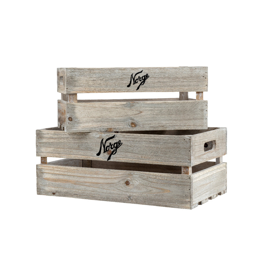 Dekorative trekasser i to størrelser med den kjente Norge logoen. Kassene er røffe i finishen for ett vintage utseende.