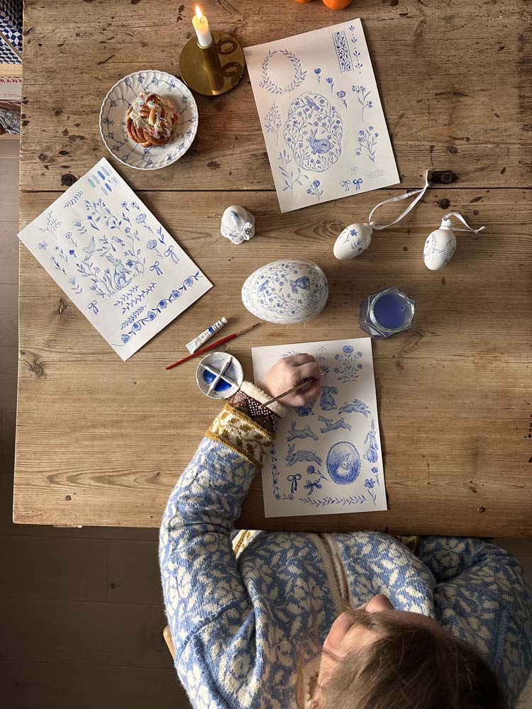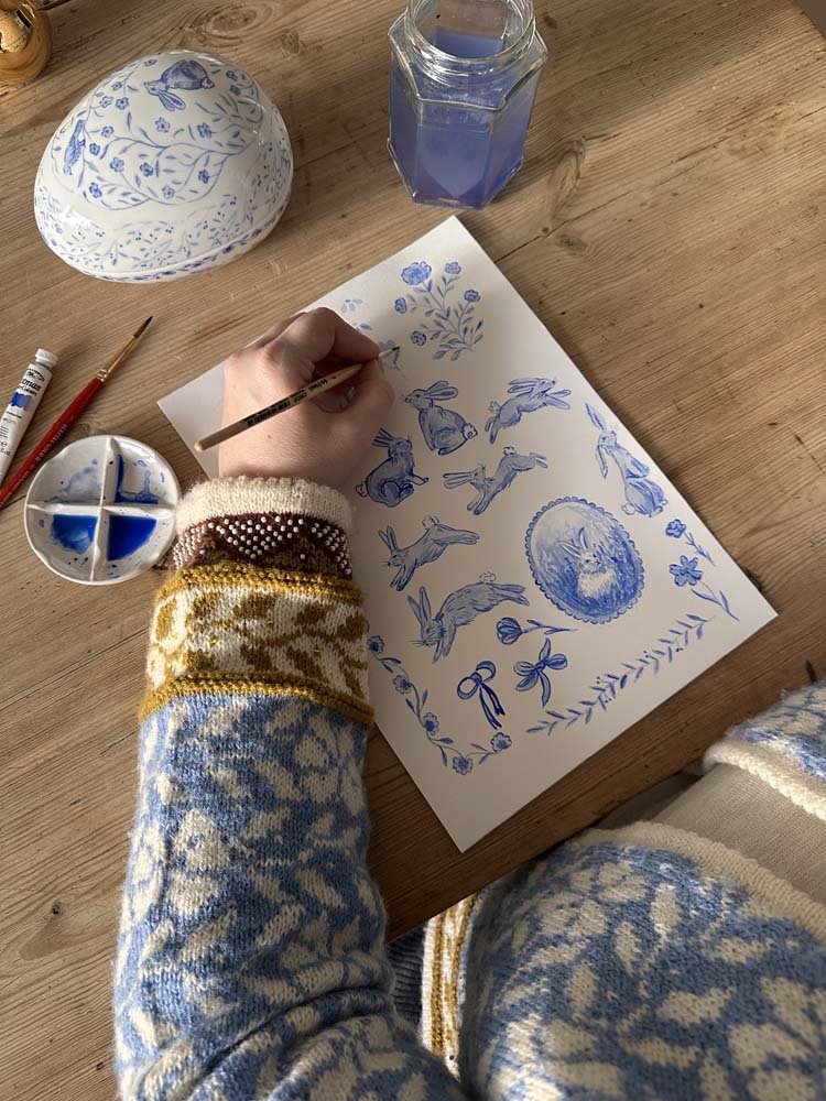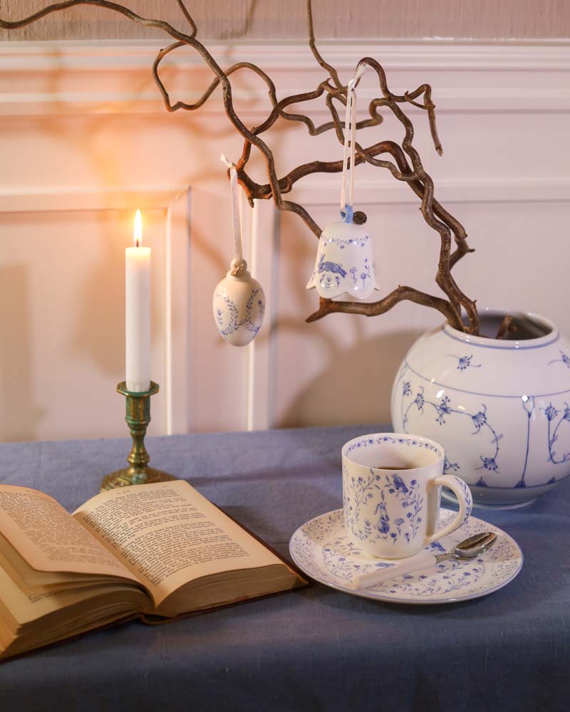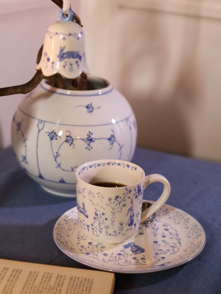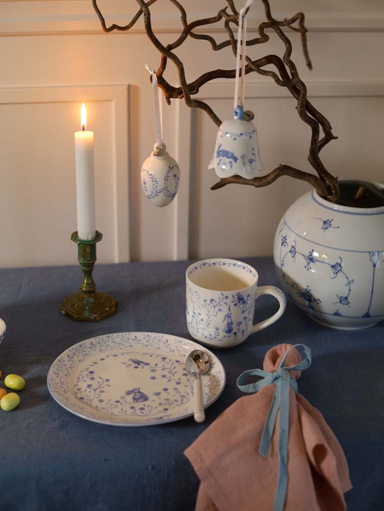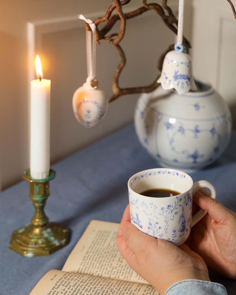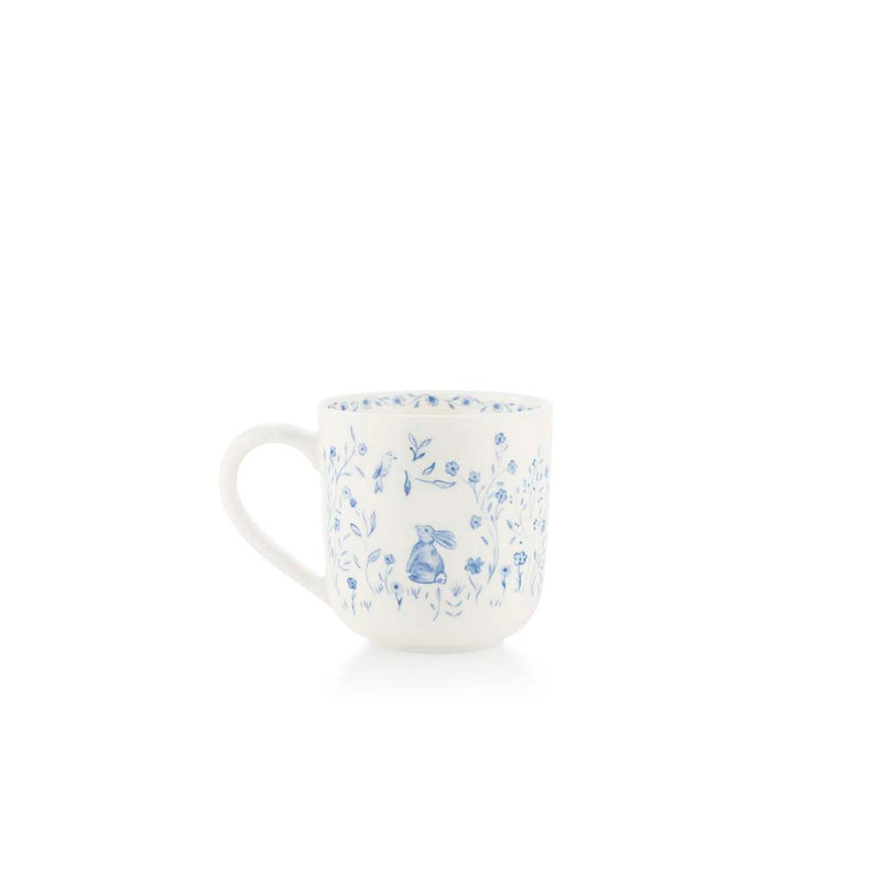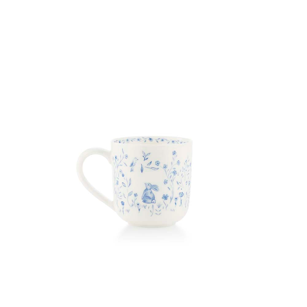 En sjarmerende kopp dekorert med blå påskehare. Perfekt til kaffe, te eller kakao i påsken, og en hyggelig detalj på frokost- eller påskebordet.
