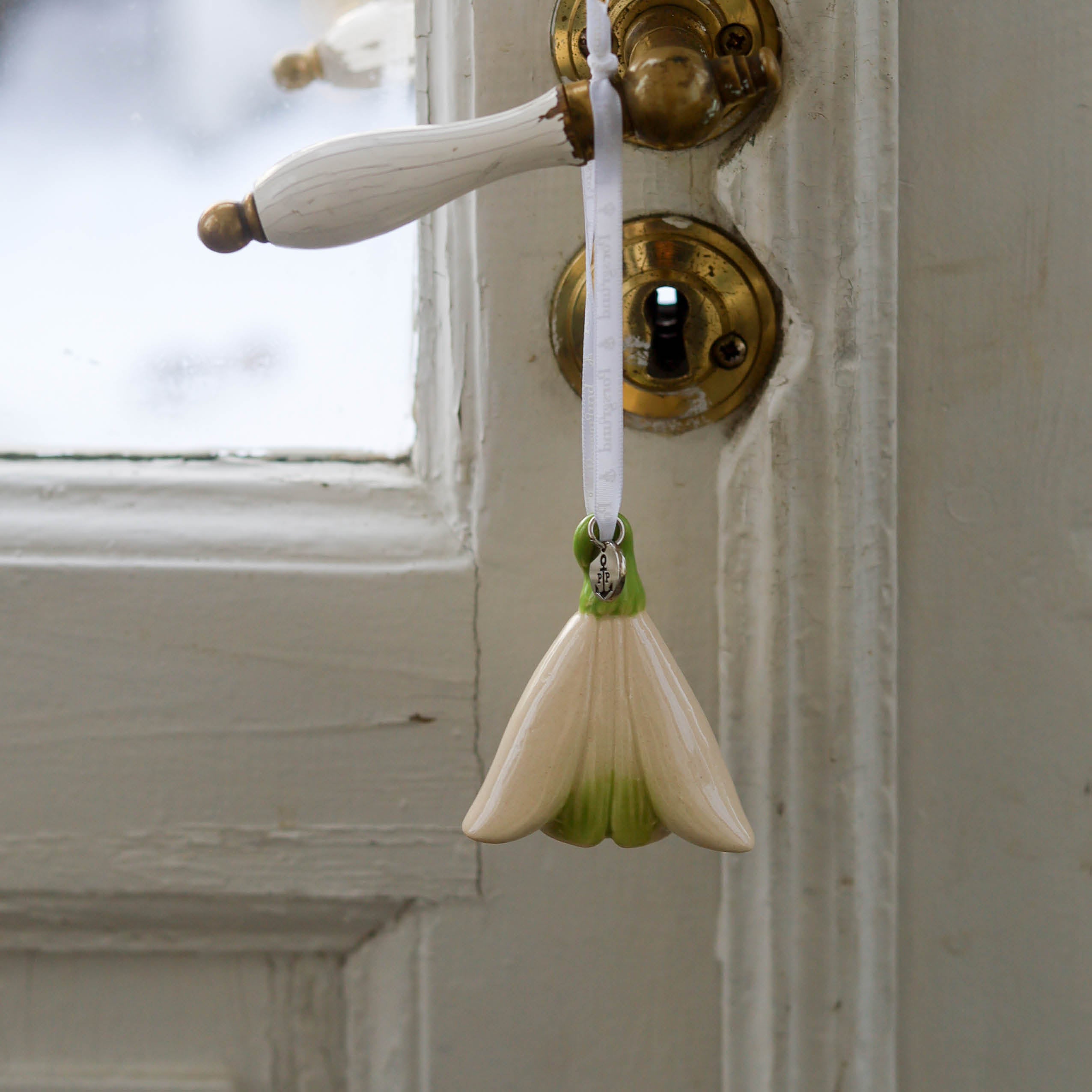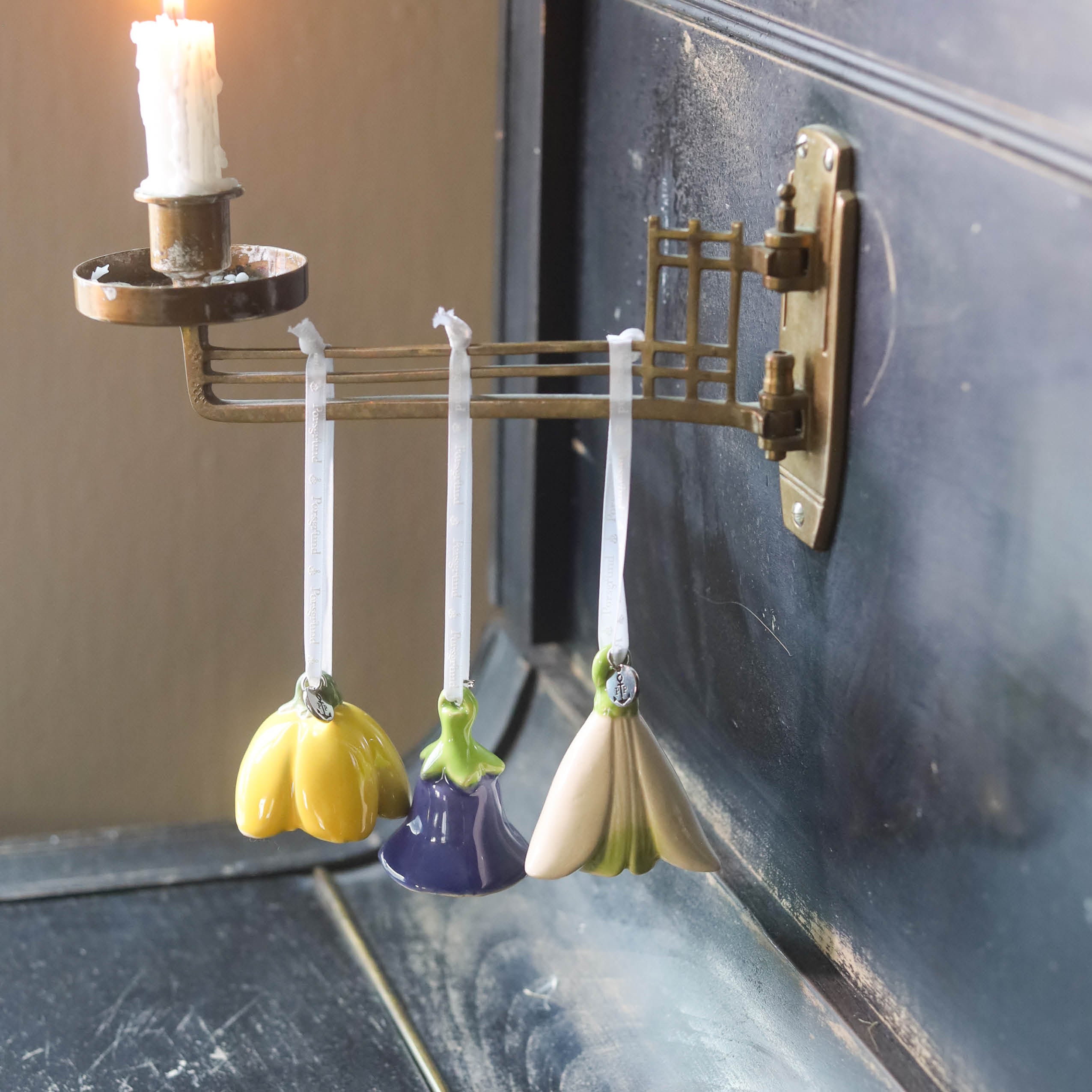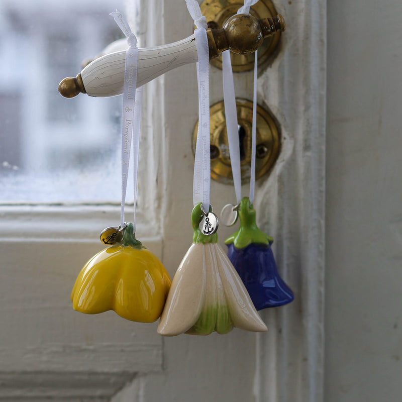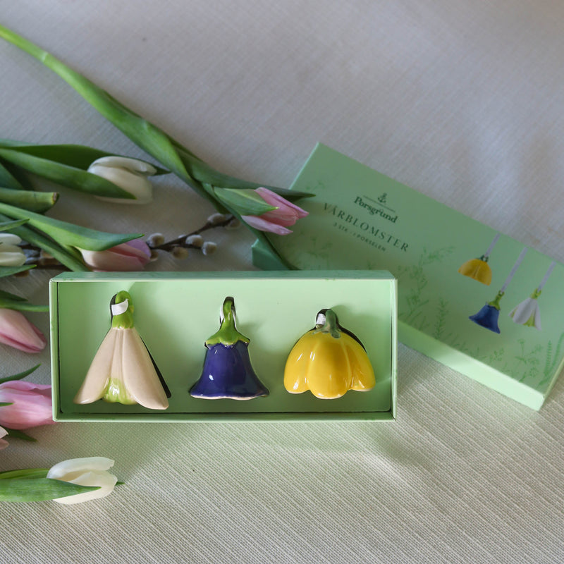 Dekorative vårblomster i porselen med silkesnor. Pakken inneholder tre vakre blomster: smørblomst, blåklokke og snøklokke. Disse delikate blomstene er perfekte for å henge på grener, kvister eller på påskebordet for å spre vårglede og liv til hjemmet.