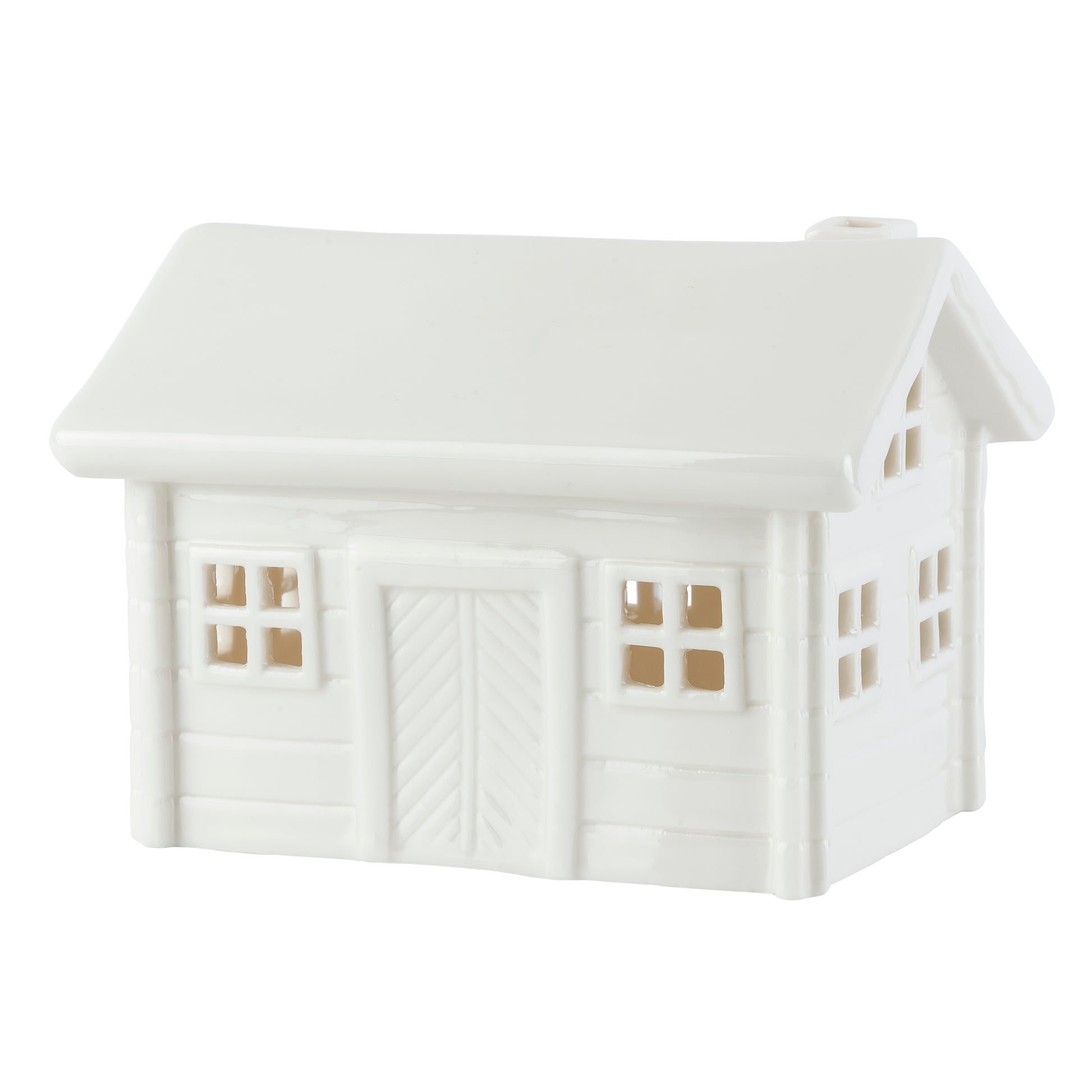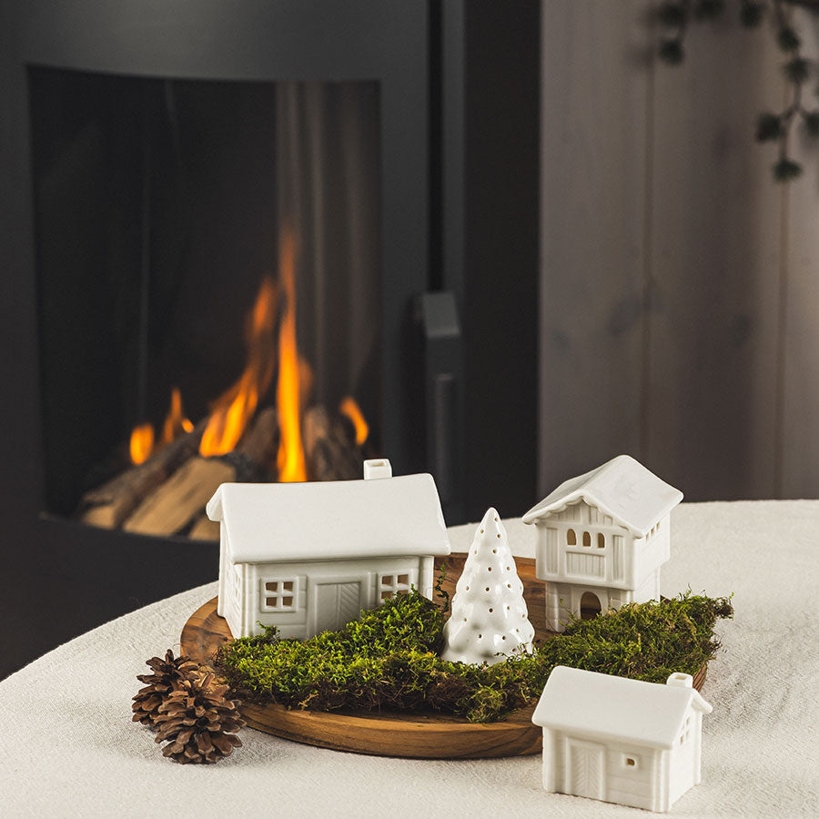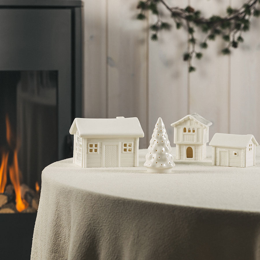 Skap et hyggelig miljø i hjemmet med vårt lille tun, bestående av koselige hus i porselen, inspirert av laftede trehus.